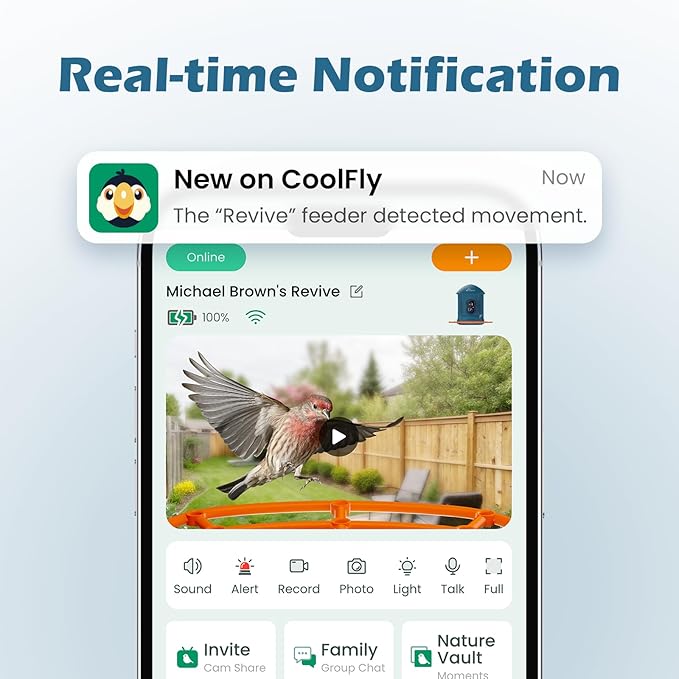 - Guess & Learn with Al Clues: Receive instant alerts when birds visit your bird feeders for outdoors. Watch, save, and share recorded clips in the CoolFly app. Post your sightings on CoolFly Square, and the CoolFly will generate three species identification results based on AI rules, or let community members assist in identification. Turn every visit into an interactive learning experience