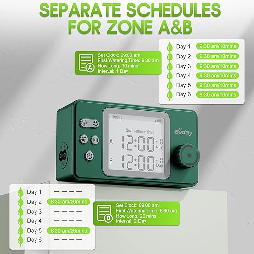 - CUSTOMIZABLE TIMER WITH SCREEN DISPLAY - Set your watering frequency and duration with precision. The built-in screen clearly shows the next scheduled watering time, so you always know what’s coming next