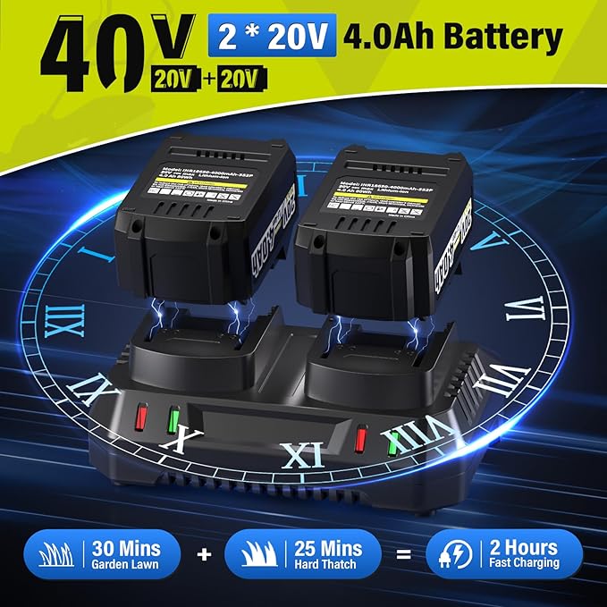 - Dual Battery System for Extended Runtime: Comes with 20V 4.0Ah lithium-ion batteries, providing longer runtime to tackle large lawn areas with ease. The batteries support fast charging, ensuring they are always ready for use and meeting your extended mowing needs