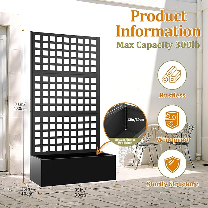 - 🛡️【Outdoor Privacy Screen & Metal Planter Box with Trellis】Use this metal planter box with trellis to create a natural divider on your patio, balcony, or yard. It’s more than just a garden raised bed for climbing plants—it’s also a beautiful metal planter with privacy screen that offers shade and separation. The sleek black frame and vertical lines of this metal planter box with trellis make it both decorative and practical.