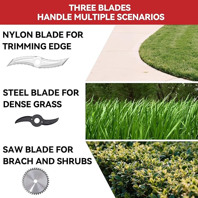 - β[Three Blade] Three blades for all jobs: Saw blade for branch and shrubs; Steel blade for dense grass; Nylon blade for edgeβ no extra tools needed.