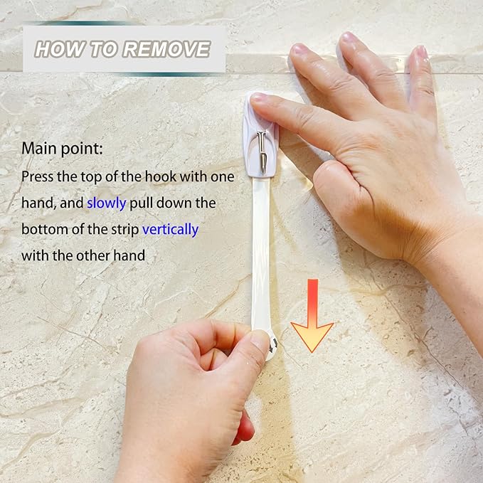 - 【REMOVABLE HEAVY DUTY HOOKS】Lightly hold the top of the wall adhesive strips and slowly pull straight down towards the floor to remove the hanging hooks and prevent damage to walls and surfaces.