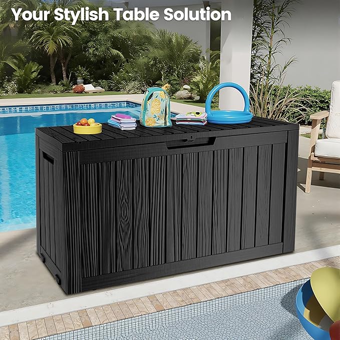 - Secure and Portable Convenience: The lid is equipped with a reliable latch to keep your items safe from moisture and pests. Lightweight and easy to move, this deck box is a versatile storage solution that can be effortlessly relocated to your patio, garden, or pool area, adapting to your needs with ease
