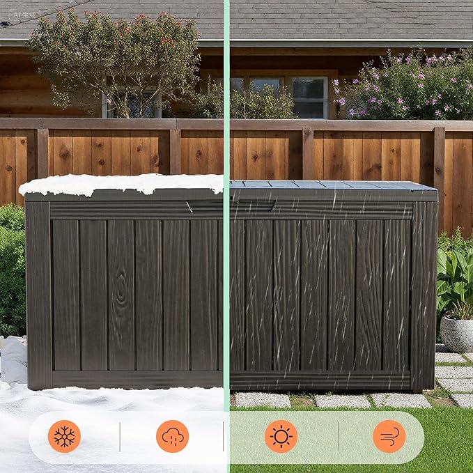 - Durable Weather-Resistant Construction: Crafted from premium, fade-resistant materials, our deck box is designed to withstand the harshest weather conditions. The sturdy lid effectively shields your belongings from rain, snow, and sun damage, ensuring long-lasting durability and protection