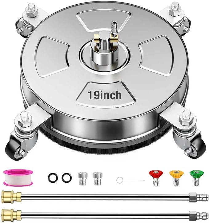 19" Pressure Washer Surface Cleaner with 4 Wheels, Stainless Steel Housing, 4000 PSI Max, 3 Connect Nozzles & 2 Extension Wands, Pressure Washer Surface Cleaner for Concrete, Patios, Sidewalks