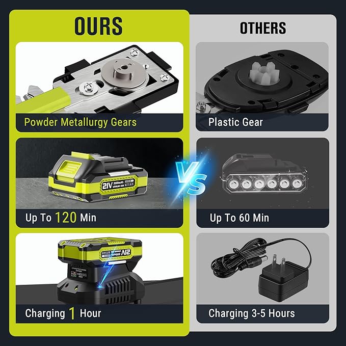- ✅ UL-Listed fast charger & High-performance 2000mAh lithium battery, 60-minute fast charger – enjoy 60+ mins continuous runtime. Battery has a built-in intelligent protection system. Compatible with EWORK 21V series (Leaf Blower/String Trimmers). 500+ cycle battery lifespan tested. Battery Management System (BMS) actively guards against overcharging/overheating/short circuits while maintaining 80% capacity after 800 cycles