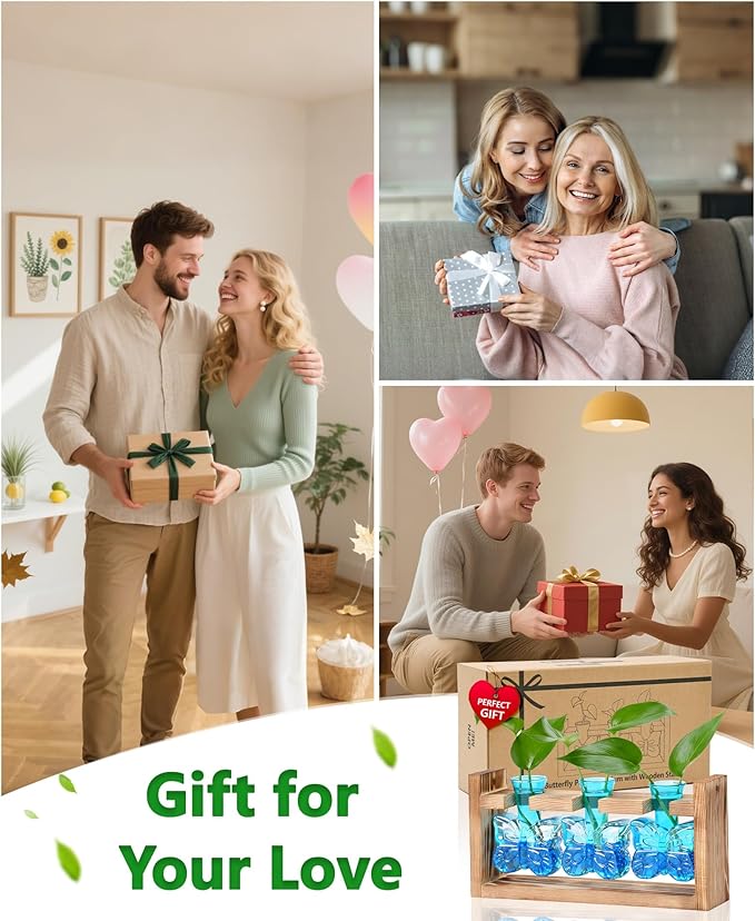 - Thoughtful Propagation Set:Our Butterfly-Shaped plant terrarium includes Natural wood stand, 3 star vases, cleaning brush, 200g decorative stones, illustrated guide. Everything for instant hydroponic setup! Transparent glass showcases mesmerizing root growth
