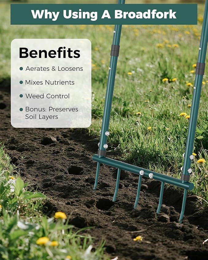 - Efficient Soil Preparation: This broadfork garden tool (40"x18.7") is perfect for breaking up hard or rocky soil, loosening dirt, uprooting weeds, and turning compost. Use it as a spading fork for planting, a digging fork for root vegetables