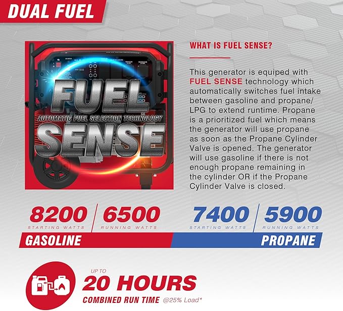 - Dual fuel technology: this portable generator is equipped with dual fuel technology which gives a run time of up to 20-hours at 25% load with 6.3 Gal., fuel tank on gasoline and 17-hours of run time at 25% load on LPG with a standard 20 lbs. propane tank
