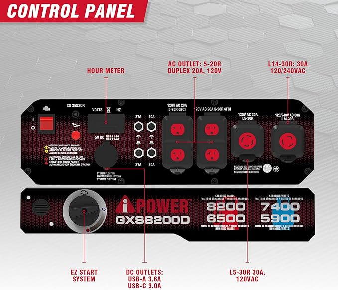- Multi-featured control panel: the control panel consists of CO sensor indicator light, data center display, 2 x 5-20R duplex 20 Amp 120-Volt, 1 x L5-30R 30 Amp 120-Volt, 1 x L14-30R 120-Volt/240-Volt 30 Amp twistlock, 1x USB-A 3.6A, 1x USB-C 3.0A