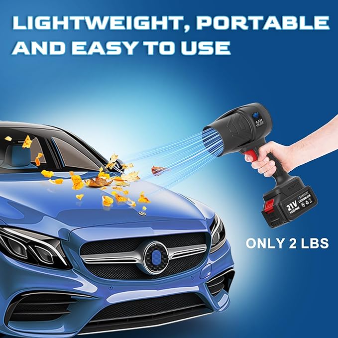 - 【Lightweight & Easy to Use】Weighing only 2 pounds, is compact and lightweightthis cordless leaf blower is designed for one-handed operation, reducing fatigue during prolonged use. The cordless design eliminates the hassle of tangled wires and gives you flexibility while carrying it for camping or traveling without adding any extra weight