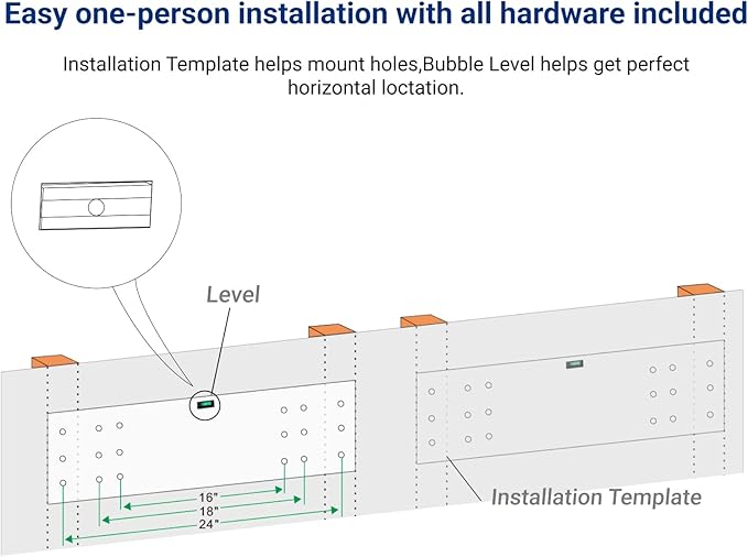 - Easy to Install: Can be easily installed by one person and includes all necessary hardware. The installation template helps mark the holes, and a bubble level ensures perfect leveling.