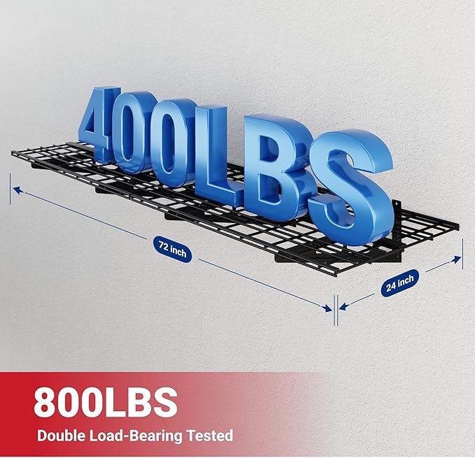 - 800 lbs Tested, 400 lbs Total Rated Capacity: Our garage wall shelving unit has been rigorously tested with a total weight capacity of 800 lbs, ensuring unparalleled safety and durability. It has a total rated capacity of 400 lbs, with each individual unit capable of holding up to 200 lbs.