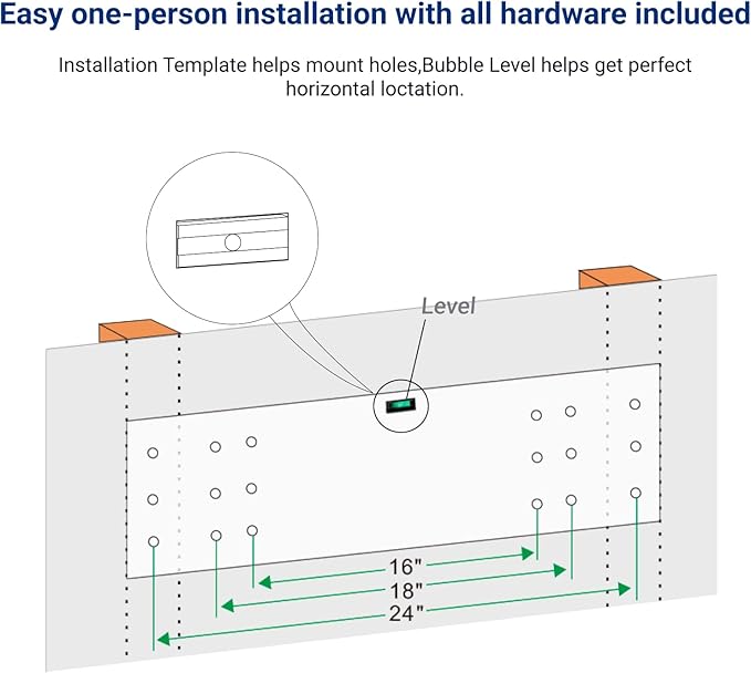 - Easy to Install: Can be easily installed by one person and includes all necessary hardware. The installation template helps mark the holes, and a bubble level ensures perfect leveling.