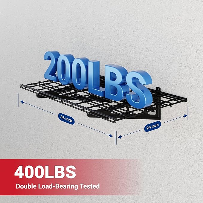 - 400 lbs Tested, 200 lbs Total Rated Capacity: Our garage wall shelving unit has been rigorously tested with a total weight capacity of 400 lbs, ensuring unparalleled safety and durability. It has a total rated capacity of 200 lbs, with each individual unit capable of holding up to 200 lbs.