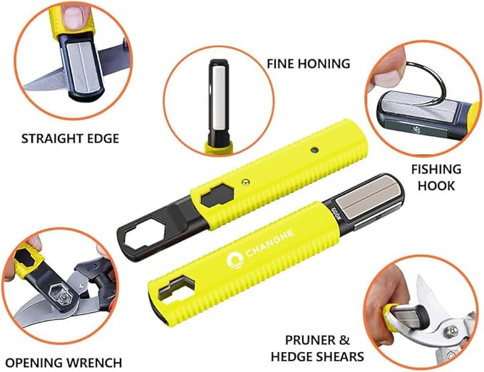 - 【5-In-1 Design】This 5-in-1 garden tool sharpener has an HRC 85 tungsten carbide and 360# diamond abrasives for coarse sharpening, 600# diamond abrasives and 1000# ceramic is ideal for honing both single and double-bevelled blades including pocket knives, mower blades, garden pruner, loppers, hedge shears, axe, machete, hatchets, scissors, edged tools.