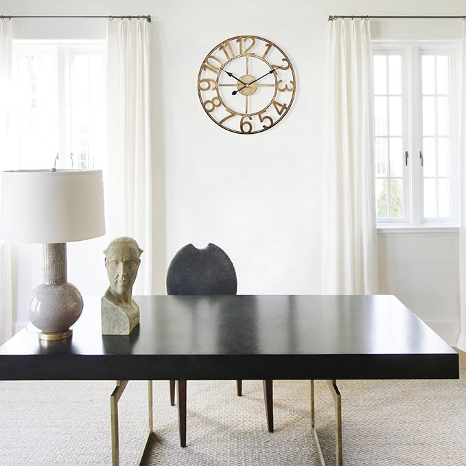 - 🕛【Industrial Elegance】- Large Metal Wall Clock! Enhance your interior and exterior décor with this 24 inch large wall clock, featuring a cut-out open face and classic black hands with moving gear, adding a vintage industrial touch. Crafted with a sleek single-ring metal structure, this oversized iron wall clock exudes simplicity and depth, free from a glass cover and traditional seconds hand.