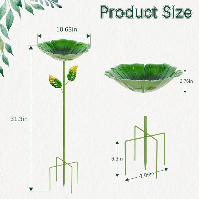 - Perfect size: The small bird bath bowl diameter: 10.63 inches, flower birds bowl height: 2.76 inches. The overall bird baths with stake height: 31.3 inches, can store enough water and feeder, and which is convenient for observing the use and keeping the center of gravity stable, and harmoniously integrated into the garden scene.