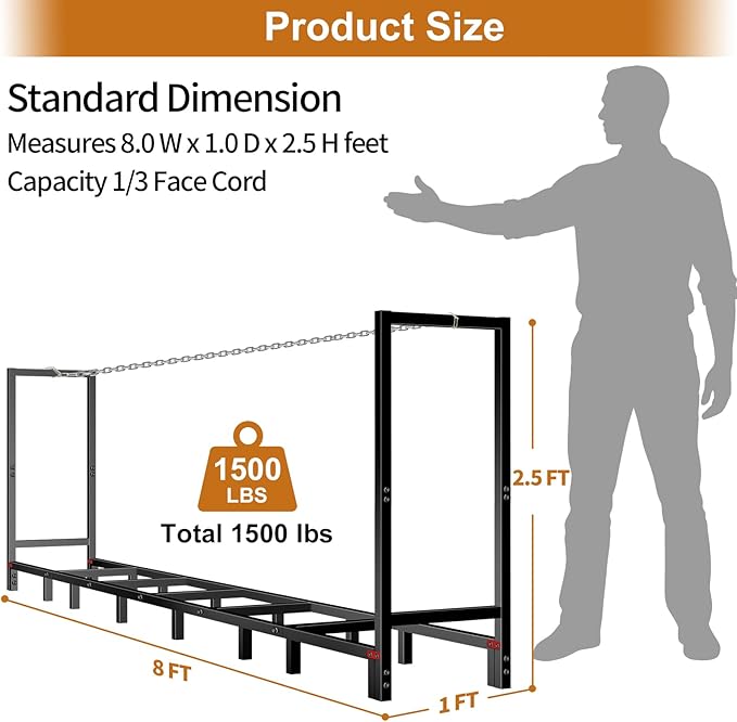 - 【Large Capacity】- The firewood rack outdoor indoor is 8ft(L) x 0.9ft(W) x 2.5ft(H). It can store up to 1/3 face cord of firewood. It makes your life easier by stocking up on firewood for your home and yard.