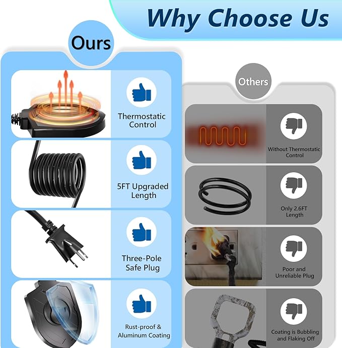 - 【Easy to Use & Upgraded Cord Length】Just place the bird bath heater in the center of your bird bath, ensure the heater is full covered by water and plug in, it will start to work automatically. Our upgraded birdbath de-icer comes with a longer power cord, approximately 4.7FT, making outdoor installation easier than ever.