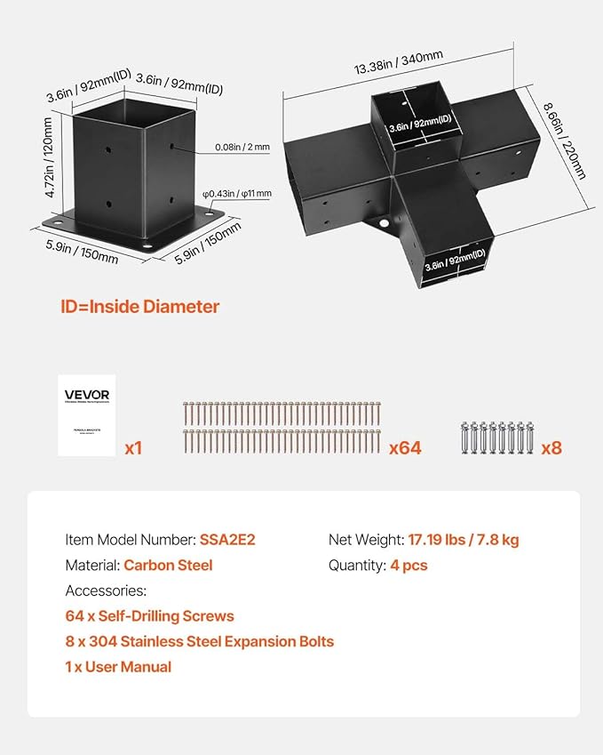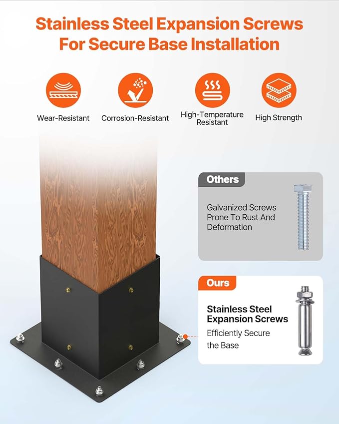 - Strong Fixation: The pergola bracket kit features upgraded stainless steel expansion screws with high hardness and corrosion resistance for lasting strength. Extended to 60 mm, the anchors provide secure installation on concrete, wood, and other surfaces
