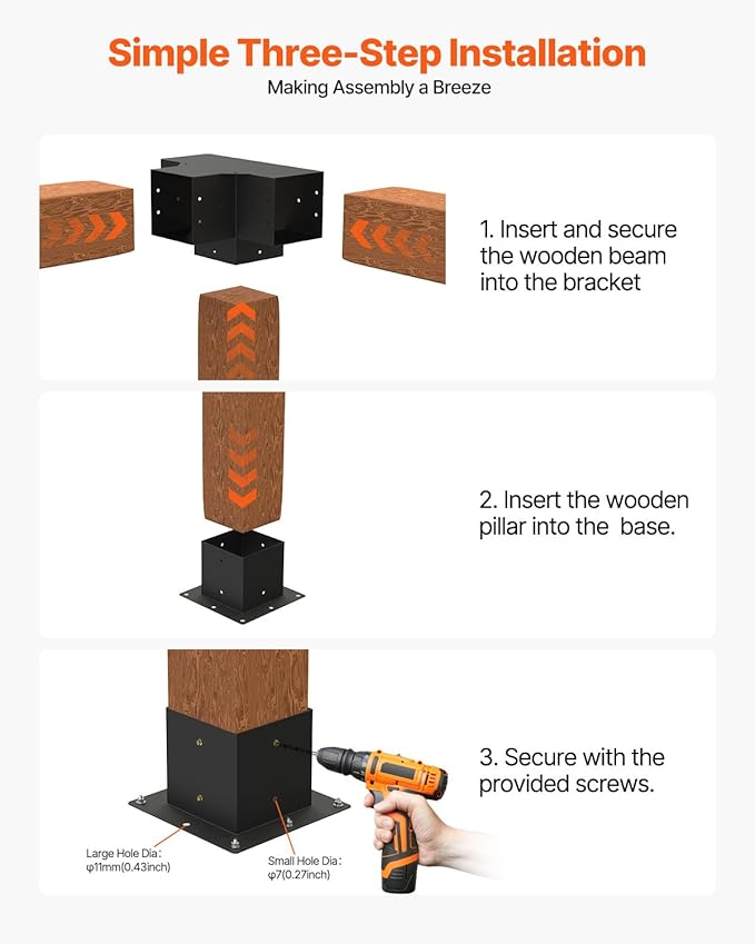 - Complete Accessories, Easy Installation: The pergola kit includes 2 x 4-way corner brackets, 2 x post base brackets, and all necessary screws. Just cut the wood, insert it into the brackets, tighten, and secure the posts into the base plates. Quick assembly makes it easy even for non-professionals