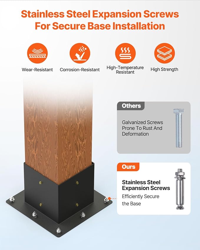 - Strong Fixation: The pergola bracket kit features upgraded stainless steel expansion screws with high hardness and corrosion resistance for lasting strength. Extended to 60 mm, the anchors provide secure installation on concrete, wood, and other surfaces