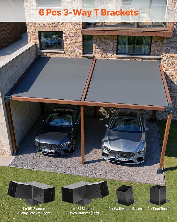 VEVOR Pergola Kit, 4x4 Inch 3-Way Slanted Brackets for 3.5x3.5 Inch Wood Beams in Actual Size, 2-Pack Pergola Brackets with 2 Post Bases and 2 Wall Mount Bases, for Outdoor Pergolas, Gazebos, Sheds