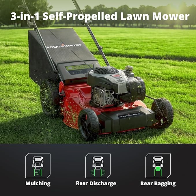 PowerSmart 21-Inch Gas Lawn Mower with B&S Engine, 3-in-1 (Bag/Mulch/Rear Discharge), Self-Propelled, 6 Cutting Heights, Durable Steel Deck, Rear-Wheel Drive