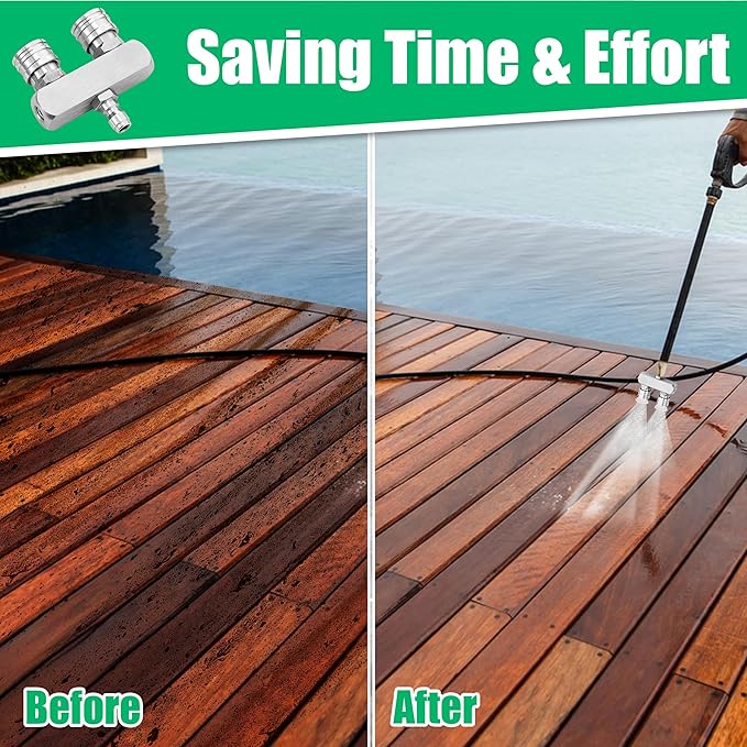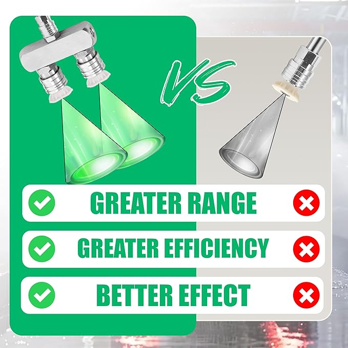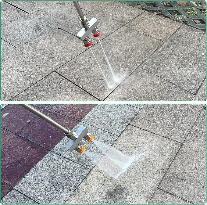 - Dual-Nozzle Efficiency System: This dual pressure washer nozzle delivers twice the cleaning coverage with synchronized dual spray jets. The innovative overlapping water distribution covers 60% more area than single nozzles, significantly reducing cleaning time for large surfaces like driveways and patios.