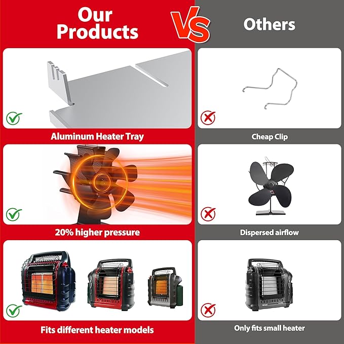 - Premium Wood Stove Fan: Our enhanced stove fan is constructed with rust-proof fireproof aluminum housing, 6-blade aluminum fan raise air circulation efficiency by over 55%, silent operation noise <25dB. [Customized Bracket Tray Included].