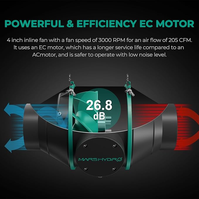 - 【205CFM ADJUSTABLE&EFFICIENT VENTILATION SYSTEM】The Inline fan blades have a mixed flow design to provide active air to your growing space, the fan runs at 2600 RPM,adjustable speed from 0 to 100%,and provides 205CFM of airflow. Only 26.8 dB noise. 1050+ RC 48 Australian Virgin Charcoal with 25ft length flex ducting,effectively filters impurities and odors from the air.