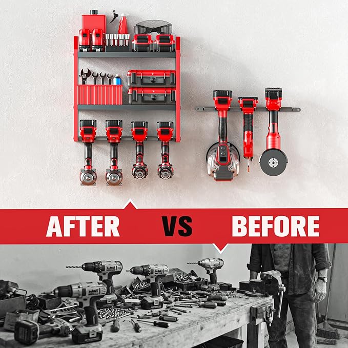 - 【DOUBLE THE CAPACITY WITH BUILT-IN & ADDED STORAGE】 The red-accented main organizer includes black shelves, a dedicated drill slot, and space for batteries. This bundle is completed with a matching all-black drill holder, constructed from the same heavy-duty steel, significantly increasing your total storage options.