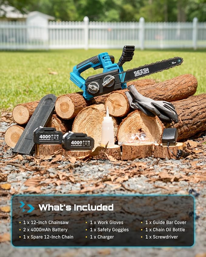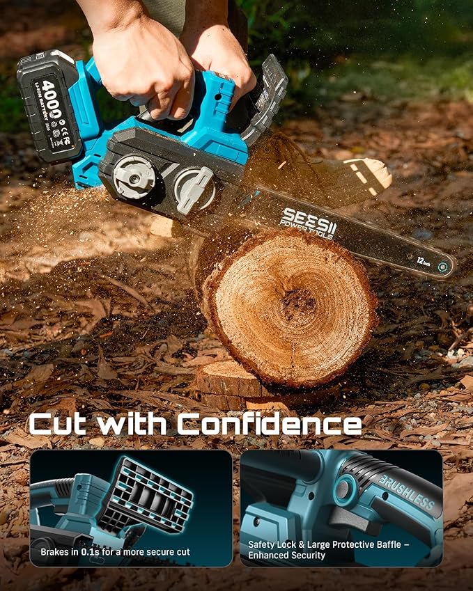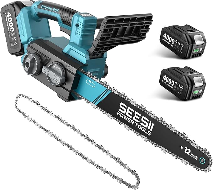 SEESII Electric Chainsaw Cordless 12-inch: Brushless Battery Powered Chainsaw, Includes 2 x 4.0Ah Batteries, Auto-Tension and Oiling Chain Saw for Dad Husband Father Day Gifts, Tree Cutting Trimming