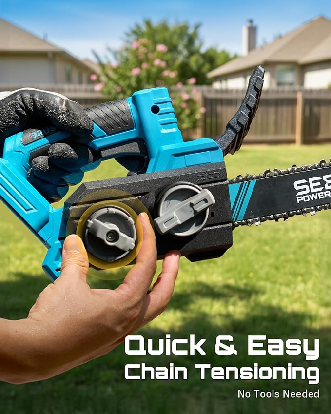 - TOOL FREE TENSION: This battery powered chainsaw features a built-in chain tension knob for quick and easy adjustment—no screwdrivers or extra tools needed. Whether you're pruning branches, cutting wood, or trimming limbs in your garden, yard, or orchard, enjoy fast and hassle-free chain tightening. Ideal for beginners, DIYers, and gardeners seeking efficient and convenient outdoor tool operation