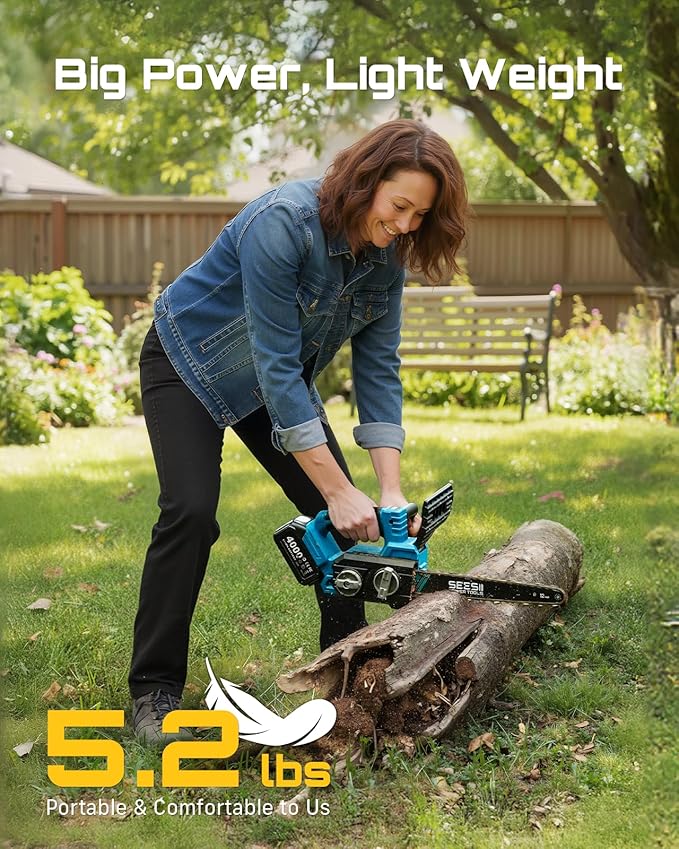 - ERGONOMIC & LIGHTWEIGHT COMFORT: Weighing just 8.5 lbs, this compact, portable battery operated chainsaw features a slip-resistant, shock-absorbing grip for easy one-handed control. The ergonomic handle reduces fatigue, making it ideal for users of all experience levels, including gardeners, arborists, seniors, and women—ensuring comfort during extended use and overhead work.