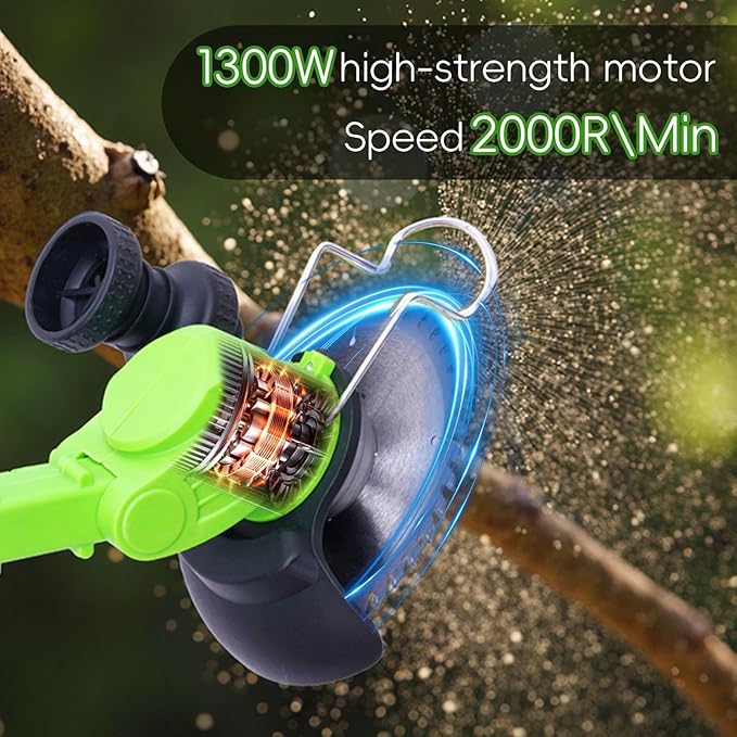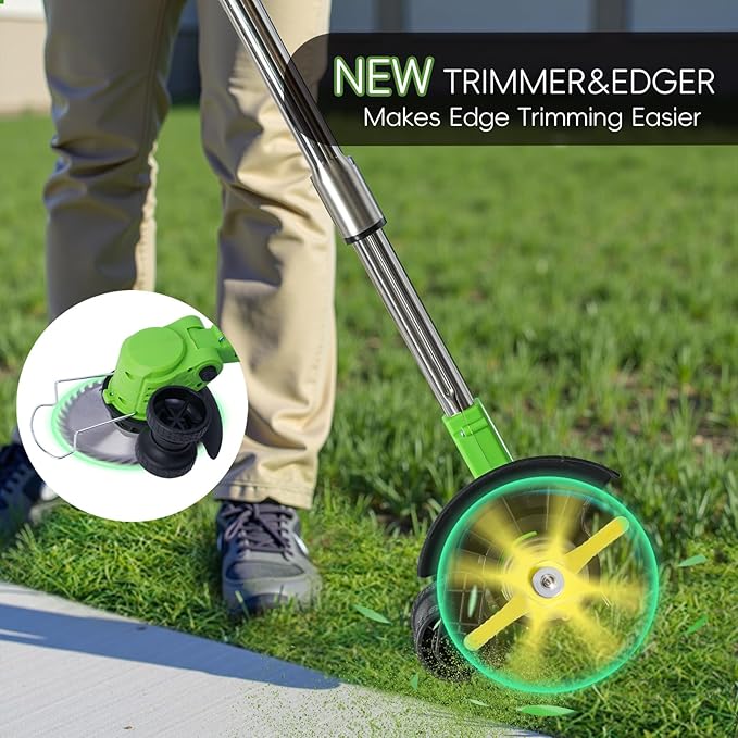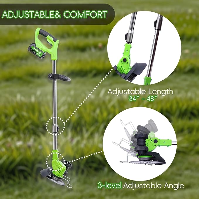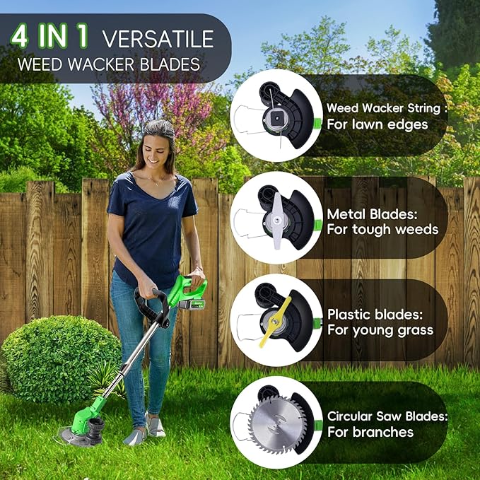 - 4-IN-1 WEED TRIMMER & EDGER : To better meet your dual needs for maintaining your garden lawn, the battery weed wacker with charger can be effortlessly adjusted from a weed trimmer to an edger; Additionally,Optimize your battery powered weed eater with metal blades (lawns/weeds), circular saw blades (branches up to 6”), plastic blades and wire rope (delicate grass and edges). Designed for slopes, fence lines, and lawn edges—ensuring your weed wacker cordless adapts to any terrain