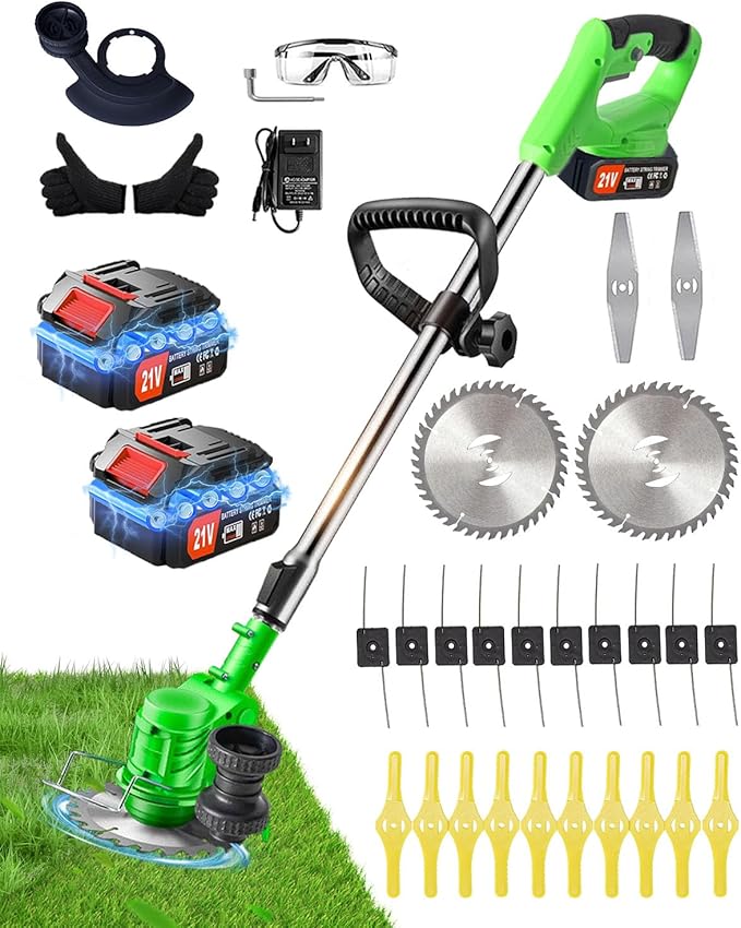 - COMPLETE GRASS TRIMMER PACKAGE: Each purchase includes everything you need to start your lawn care journey: 1x cordless weed wacker, 2x 21V 3.0Ah batteries, 1x charger, multiple blades (2 metal blades, 2 saw blades, 10 plastic blades and 10 wire ropes), rotating wrenches, non-slip gloves, safety glasses, and a user manual, providing exceptional value and convenience for your gardening needs