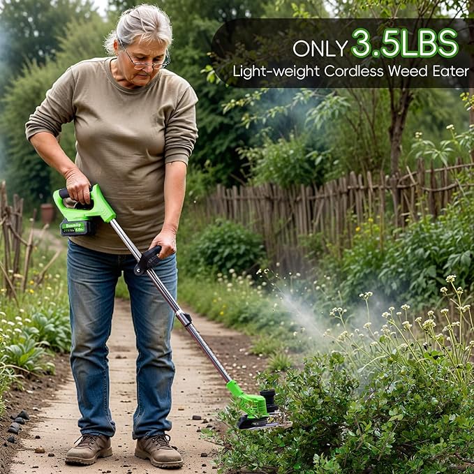 - LIGHTWEIGHT CORDLESS WEED WACKER: Experience the convenience of our electric weed wacker, designed to be ultra-lightweight at just 3.5 pounds; This ergonomically crafted brush cutter ensures maximum comfort and safety during lawn care and yard work, making it suitable for individuals of all sizes