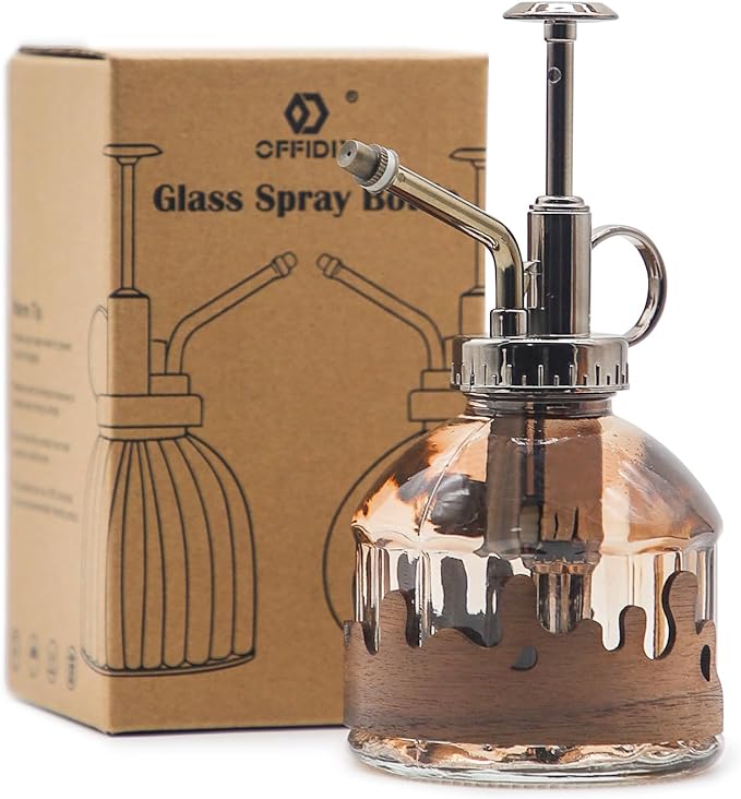 OFFIDIX Glass Plant Mister, 6.3 Inches Tall Vintage Style Spritzer Bronze Plastic Top Pump One Hand Watering Can Indoor Plant Spray Bottle for Garden, Plants, Cleaning (Morning Dew)