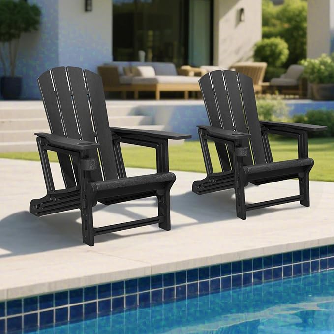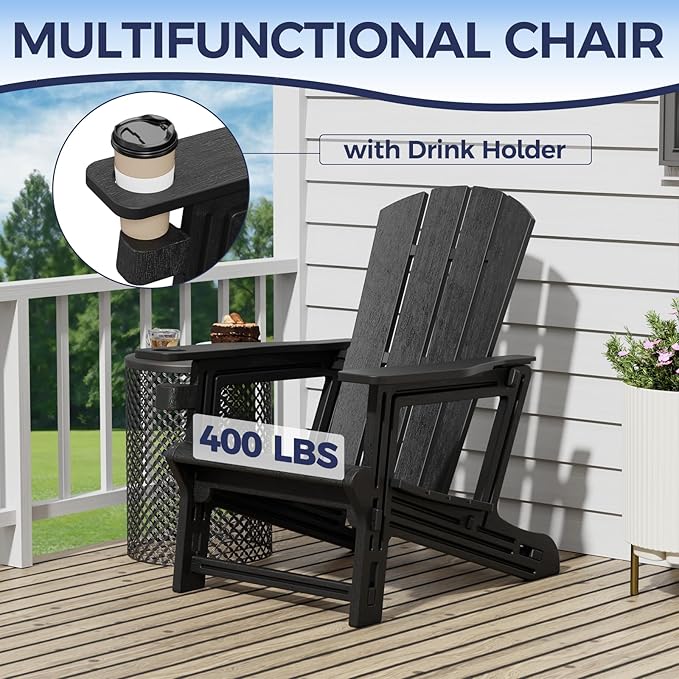 Adirondack Chair Set of 2, Plastic Adirondack Chairs, Outdoor Weather Resistant Lawn Furniture, Fire Pit Chair with Cup Holder for Garden Patio Without Screws Install, 400 LBS Capacity, Black
