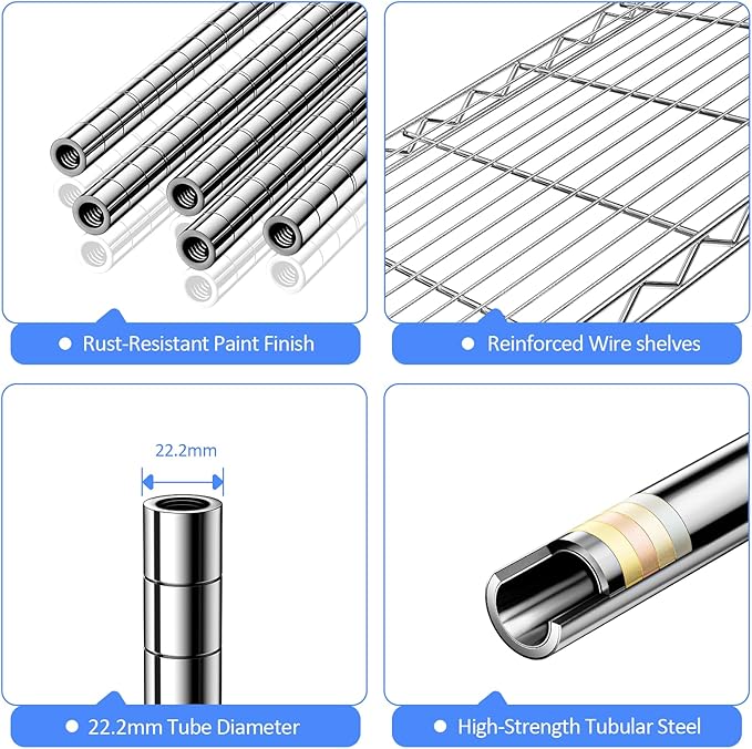 - 【Adjustable Shelves – Flexible for All Needs】Customize your storage your way. Each shelf can be easily adjusted in 1-inch increments to fit items of varying sizes—from bulky tools to compact kitchenware. This wire shelving unit adapts to your unique storage needs, creating a more organized and efficient space.