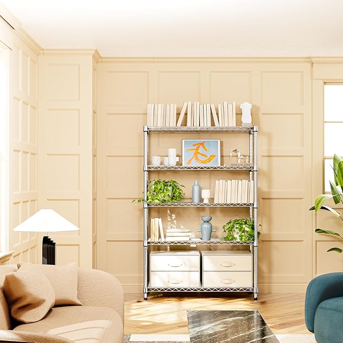 IZEUK 5-Tier Heavy Duty Metal Storage Shelving Unit (Chrome, 17.7" D x 47.2" W x 72.3" H, 1750 lbs Capacity), Adjustable Steel Wire Rack Shelf Organizer for Garage, Kitchen, Pantry, Basement, Laundry