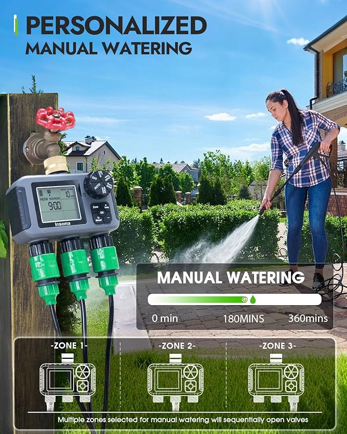 Insoma 3-Zone Sprinkler Timer with Brass Inlet + IPX5 Waterproof | Programmable Auto/Manual Irrigation Mode with Rain Delay & Large LCD | Water Hose Timer 3 Outlets for Garden, Lawn, Yard, Pool