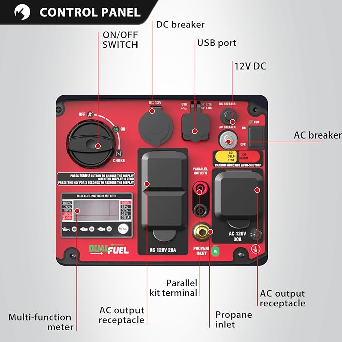 - Dual fuel: gasoline (3800 starting watts, 3300 running watts) and propane (3500 starting watts, 3100 running watts), 4.5 hours run time at 50% load