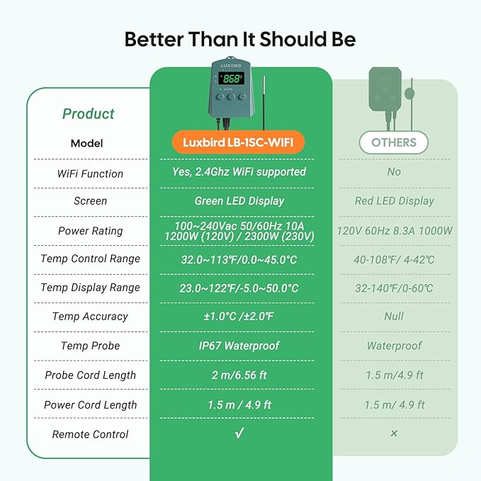 - One Controller for All Your Heating Cooling Needs – From Turtle Eggs to Craft Beer: Keep delicate ecosystems perfectly tuned between 32-113°F – whether you're hatching lizard eggs at 88°F, sprouting rare orchids at 75°F, or fermenting kombucha at 85°F. Works seamlessly with heat pads, reptile lamps, and seedling mats