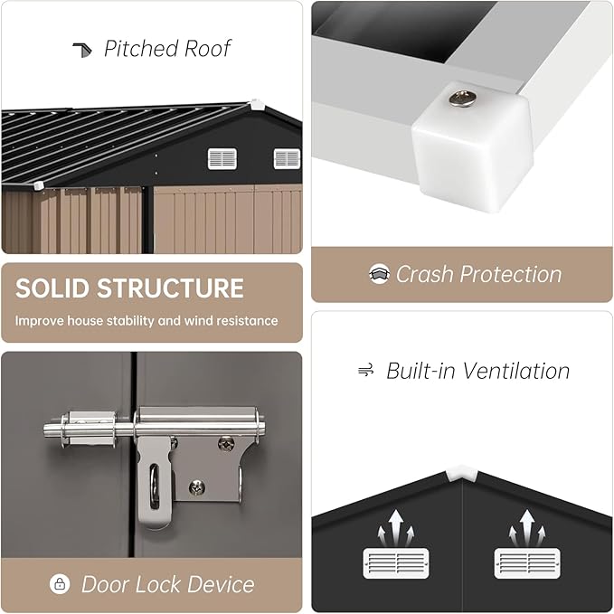 Garvee 10×8FT Outdoor Storage Shed, Metal Waterproof Garden Storage Shed Galvanized Steel Utility Tool Shed with Lockable Doors & Vents, All-Weather Shelter for Bike/Kids Car/Mowers/Tool, etc. Brown