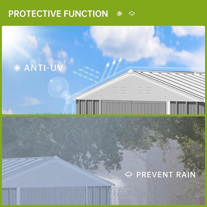 - Durable Construction: Built with a galvanized steel frame and robust corrugated steel panels featuring coating, this metal shed offers exceptional weather resistance. Its waterproof and UV-protected design withstands harsh elements. Note: Remove snow accumulation promptly from the roof